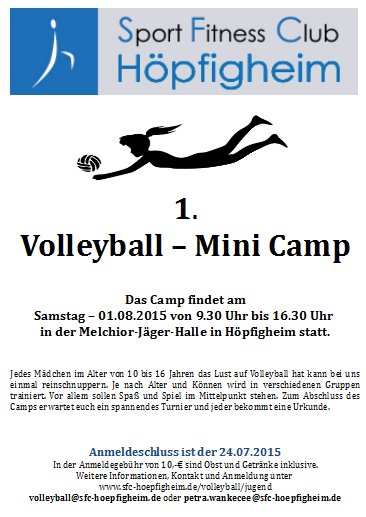 Zum ersten Mal wollen wir ein Mini-Camp in der Halle anbieten. Volleyball ist eine Mannschaftssportart und erfordert die unterschiedlichsten Fähigkeiten, die wir euch vermitteln wollen. Wir möchten euch ermöglichen bei uns einen Tag zu Schnuppern. Egal, welche Vorkenntnisse du bereits besitzt, bei uns bist du richtig. Hier wirst du entsprechend deiner derzeitigen Fähigkeiten trainiert. Du kannst hier in Höpfigheim unter fachgerechter Anleitung die Grundtechniken des Volleyballs erlernen oder verbessern. Wer weiß, vielleicht findest du so Freude oder Freunde bei dieser Sportart und möchtest sie weiter betreiben. Nutze die Möglichkeit.